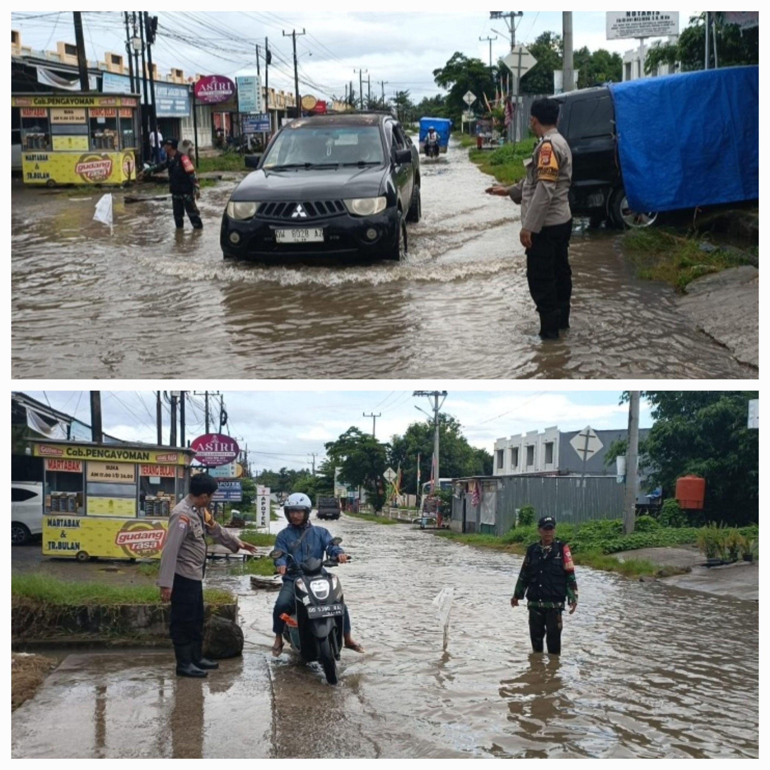 Di lokasi tersebut, Babinsa bersama aparat desa dan kepolisian membantu warga yang mengalami kesulitan melintasi genangan air, termasuk mendorong kendaraan warga yang mogok akibat terjebak banjir. Mereka juga mengatur arus lalu lintas agar pengendara roda dua maupun roda empat tidak terperangkap di area banjir.