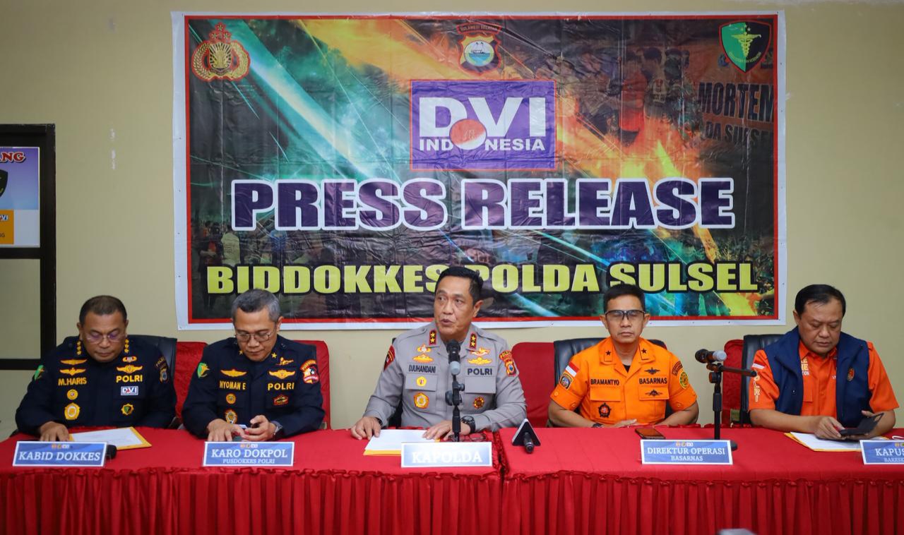 Konferensi pers dipimpin langsung oleh Kapolda Sulawesi Selatan Irjen Pol. Djuhandhani Rahardjo Puro, S.H., M.H., didampingi Karo Dokpol Pusdokkes Polri Brigjen Pol. dr. A. Nyoman Eddy Purnama Wirawan, DFM., Sp.F, Direktur Operasi Basarnas Laksamana Pertama TNI Yudhi Bramantyo, N.S., M.TR., Opsla, serta Kapusident Bareskrim Polri Brigjen Pol. Mashudi, S.I.K., S.H., M.Hum., Kabiddokkes Polda Sulsel Kombes Pol. dr. Muhammad Haris, M.A.R.S., QHIA.