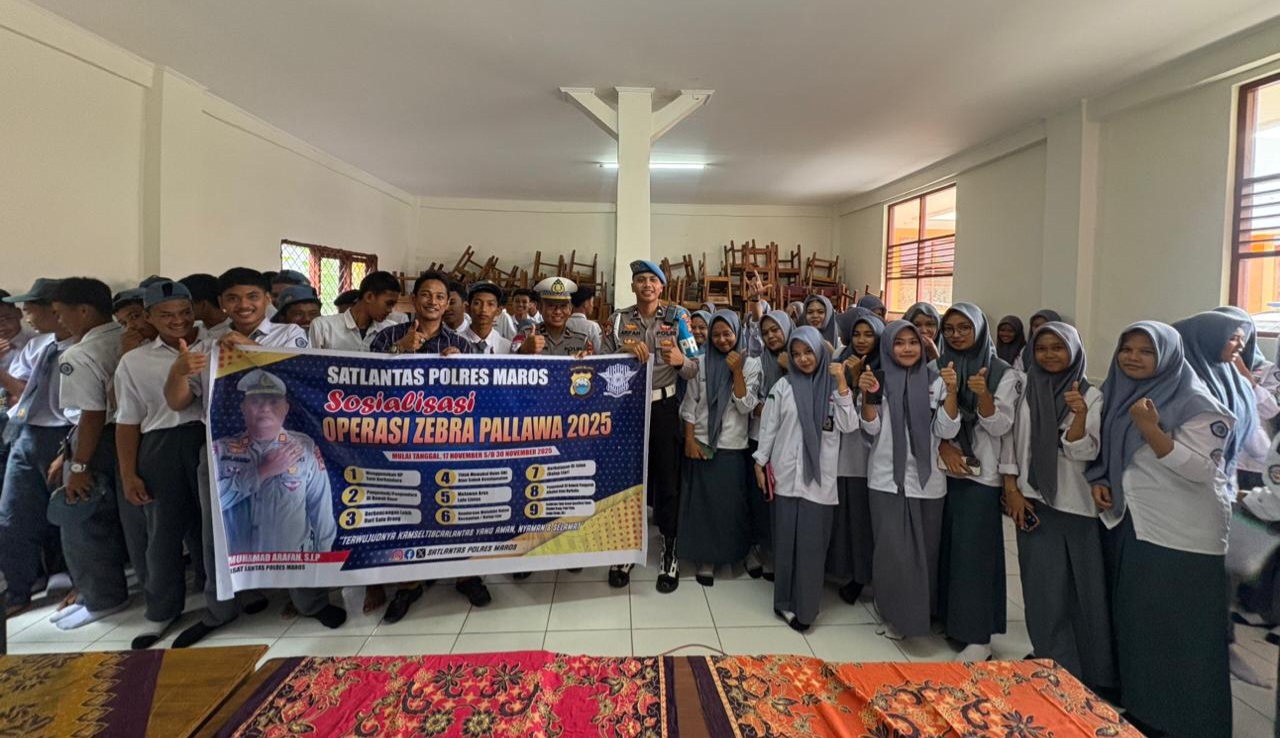 Operasi Zebra Pallawa 2025 yang berlangsung mulai 17 hingga 30 November terus digencarkan oleh Satlantas Polres Maros sebagai bentuk komitmen dalam meningkatkan keselamatan dan menekan angka pelanggaran lalu lintas. Sosialisasi di SMK Tridarma Maros berjalan aman, tertib, dan mendapatkan respons positif dari pihak sekolah dan para pelajar yang mengikuti kegiatan dengan antusias.(**)