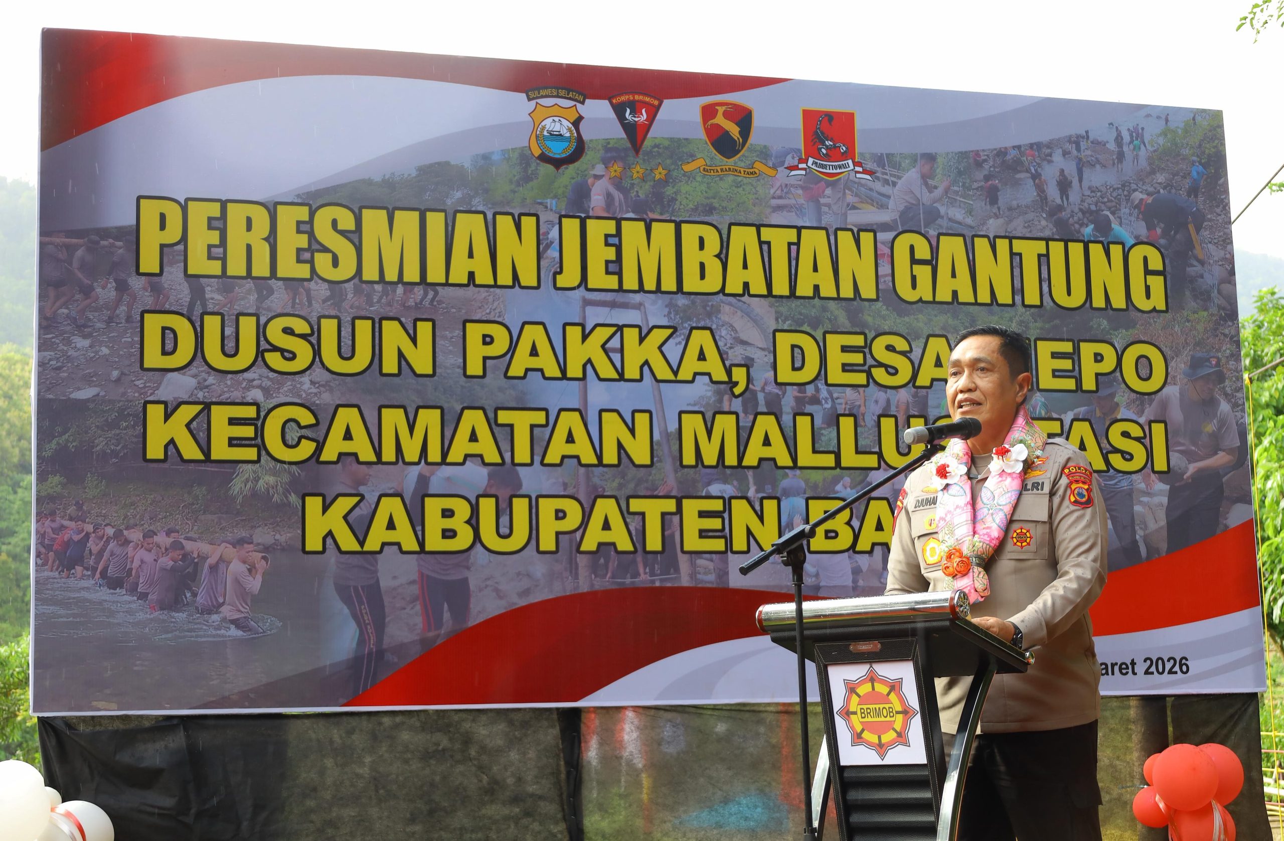 Dalam sambutannya, Kapolda Sulsel menyampaikan bahwa pembangunan jembatan gantung ini merupakan tindak lanjut atas perhatian Presiden Republik Indonesia, Prabowo Subianto, terhadap kondisi masyarakat yang mengalami keterbatasan akses, khususnya anak-anak yang harus menyeberangi sungai berarus deras untuk menuju sekolah.