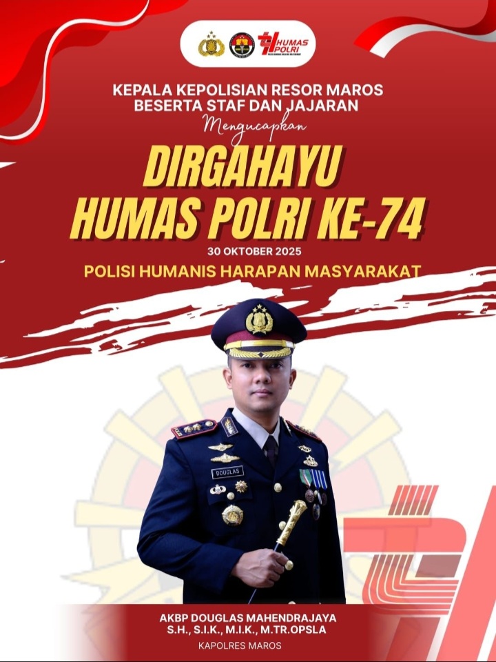 SPASISULSEL.COM – Maros _ Sulsel Kepala Kepolisian Resor Maros AKBP Douglas Mahendrajaya, S.H., S.I.K., M.I.K., M.Tr.Opsla. menyampaikan ucapan selamat atas peringatan Hari Lahir Humas Polri ke-74 yang jatuh pada hari ini, Kamis 30 Oktober 2025, dengan mengusung tema “Polisi Humanis Harapan Masyarakat.”