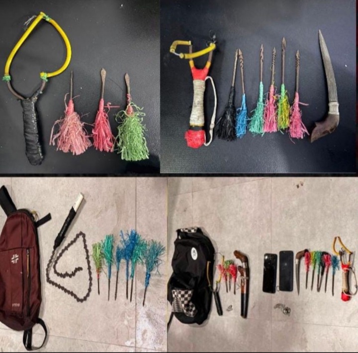 Dari hasil pemeriksaan, petugas berhasil menyita dua buah ketapel, lima belas mata busur, satu cambuk yang terbuat dari rantai chainsaw, dua bilah badik, serta dua unit sepeda motor.